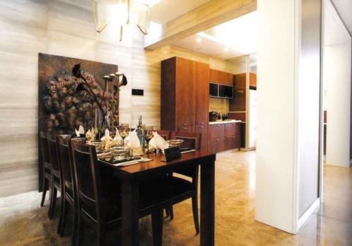 因此設(shè)計師基于這樣一個設(shè)計理念,將起居室與餐廳、餐廳與廚房、餐廳與樓梯間、餐廳與采光天井等凡是能夠流通的地方,以各種設(shè)計語言和技巧將它們巧妙地連貫在一起。這種設(shè)計手段值得我們鄭州裝修公司鑒賞學(xué)習(xí)。