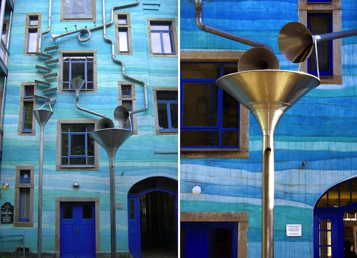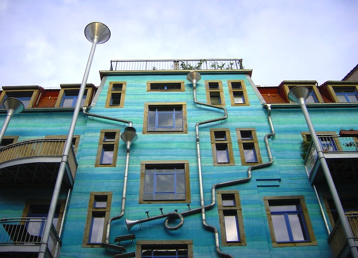 您現(xiàn)在所在的位置:首頁>行業(yè)動態(tài)>正文如果你徒步行走在德累斯頓(德國薩克森州的首府)的大街上,感受著那獨特的歐洲風情,讓其獨特的異域風光吸引著你的目光,相信還有別的東西會出乎你的意料,給你意外的驚喜,那就是位于 Kunsthof-Passage 地區(qū)的一排排擁有獨特墻壁外飾造型的房子。這些是出自設(shè)計師 Heike Bottcher 之手,并且這個名為“Court of Water”的系列墻壁裝飾尤其的引人注目,他用他獨特的奇思妙想把各種雨水管道制成各種造型,不禁外形令人忍俊不禁,應(yīng)接不暇。同時也增添了幾分人們對于雨水流在管道中的時候是否會奏響美妙音樂的好奇心。