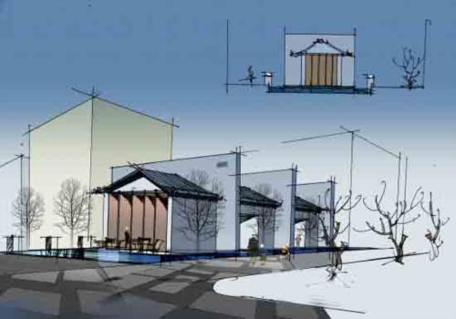 長廊與主建筑的聯(lián)系,傘座、情景樹、人的融入,形成一道別具風(fēng)味的風(fēng)景線。
