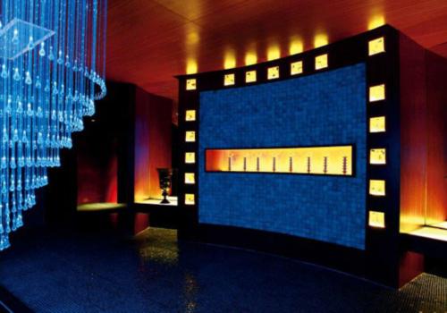 綴花玻璃與幽藍冷光和此處的暖色形成對比,冷暖色顛覆著神經(jīng)、豐富了空間的格調(diào)。美容院設(shè)計公司采用這種對比的手法,確實是絕妙之筆!