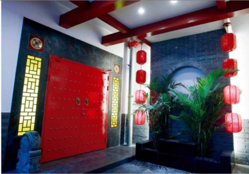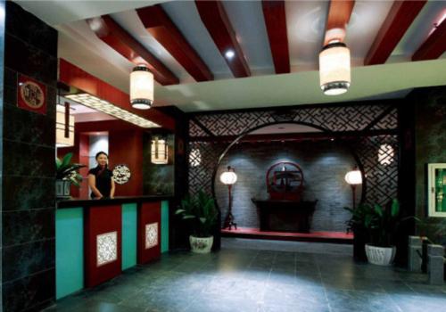 寶像莊嚴的四座大佛,再配以青磚灰瓦的裝飾墻體,渾然天成的青石鋪地,大巧不工的神臺點綴曲折悠長的走廊,以及赭紅色的墻紙。把中國古代裝飾風格表現(xiàn)得淋漓盡致。