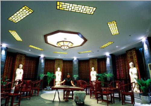 另外巧妙地運用了淡雅寫意的水榭,與大廳中式傳統(tǒng)家具環(huán)繞的古琴相互呼應,提升人與自然惜惜相依的密切關(guān)系。泉水潺潺、琴聲叮咚、昭顯了高遠的精神審美取向。