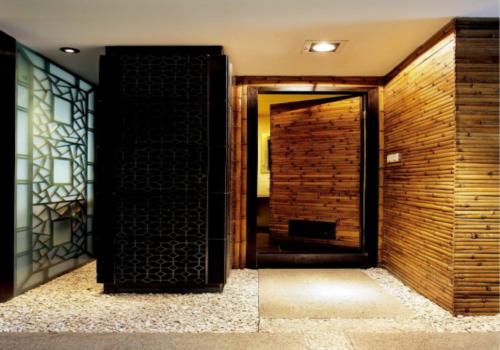 二樓因為有大量的弧形通道,設(shè)計師運用了大量的竹片拼貼于墻體更加能從這些竹片上看到古代的純樸高尚。地面配以啞光面的灰色地磚,工字的貼法淋漓盡致地表達了中式風格。自然的氣息與外面鋼筋水泥的建筑形成了對比,讓整天奔波在外的人能在這里放松身心,享受足底按摩給予的輕松快樂。