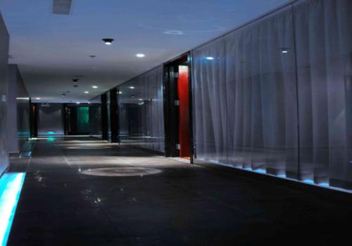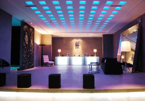 該美容院設(shè)計的另一個經(jīng)典就是男士館接待廳的燈。接待前廳與浴區(qū)就采用了蘭色的LED做為主要光源,射燈作點綴。 顯得冷靜,神秘,令人產(chǎn)生如海一般的映像。