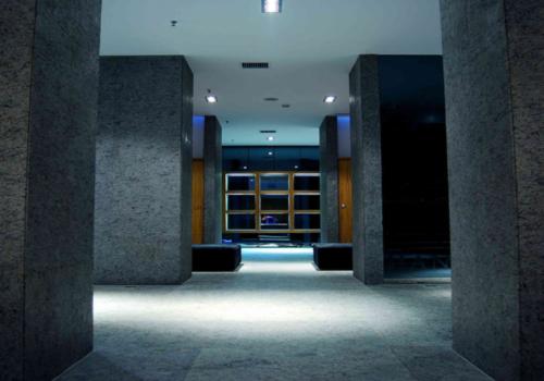 該美容院設(shè)計男士館運用大量灰色石材、灰色乳膠漆、白鋼等材料配上點光源與LED,顯得神秘,硬朗,突顯男性的陽剛。