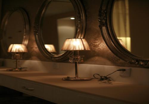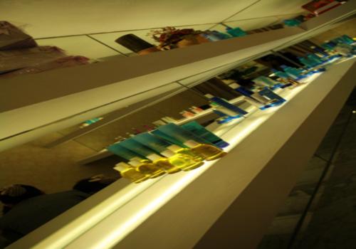 該美容院設(shè)計(jì),門(mén)廳明亮的白色木飾面和典雅的米黃石材,在燈光的點(diǎn)綴下,使空間顯得精致而靜謐! 美容院設(shè)計(jì)效果圖,精致典雅的臺(tái)燈,橢圓的雕花鏡,兩者相互映襯,把靜謐空間展現(xiàn)的更有風(fēng)采! 化妝品臺(tái)分兩層設(shè)置,化妝品有序的擺設(shè),這個(gè)陳列空間又展現(xiàn)了該美容院的另一個(gè)美妙角落!