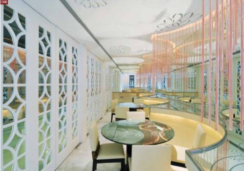 餐廳設(shè)計(jì)公司-ZDD設(shè)計(jì)師介紹說,該餐廳設(shè)計(jì)新建筑的廂座以三道白色門扇劃分空間,打開后即轉(zhuǎn)變?yōu)橐蛔腴_放式亭閏,讓人可觀望購物中心里的熱絡(luò)人流。后段的老上海樓房則運(yùn)用窗花作為圍屏,模仿古雅亭閣,維系空間的通透性,配合鏡面的反射和日光的滲透,營造柔和與和諧的光影效果,模糊場域里外的界線,為現(xiàn)代場景注入園林景致的色彩。
