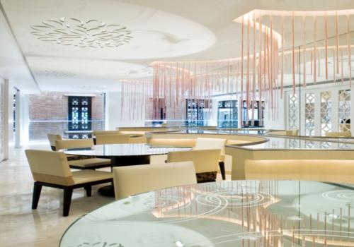 您現(xiàn)在所在的位置:首頁>會(huì)所設(shè)計(jì)>餐飲會(huì)所設(shè)計(jì)>正文該餐廳設(shè)計(jì),為了豐富餐廳的空間感和層次感,設(shè)計(jì)師在新舊建筑之間的入口回廊的天花板及立面鏤刻上荷花圖騰,仿佛一座荷花池,讓賓客在荷花綻放的身影里感受到濃濃的夏意。餐廳設(shè)計(jì)公司與您分享!