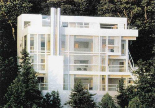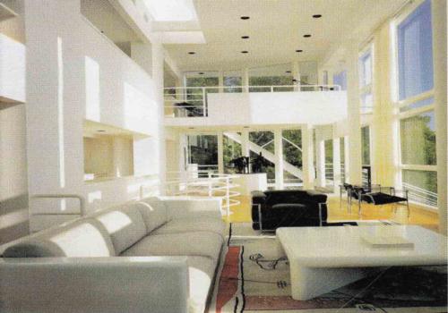 住宅是邁耶白派住宅早期的代表作,邁耶常用的手法諸如白色有分格線的墻體、平屋頂、大面積不以樓層局限的玻璃幕墻、脫離墻體的柱梁、自由生動的曲線、空靈的架子、室內(nèi)的坡道、空間彼此的滲透和咬合,在這個住宅中有著明確、具體的體現(xiàn)。
