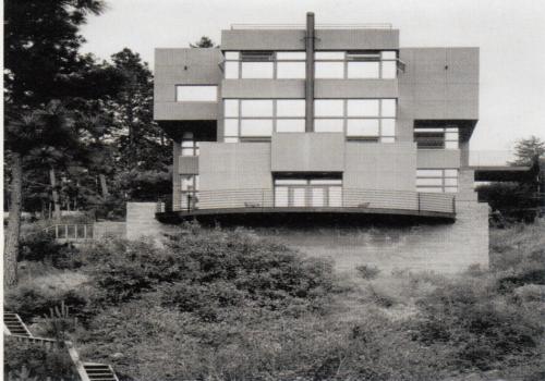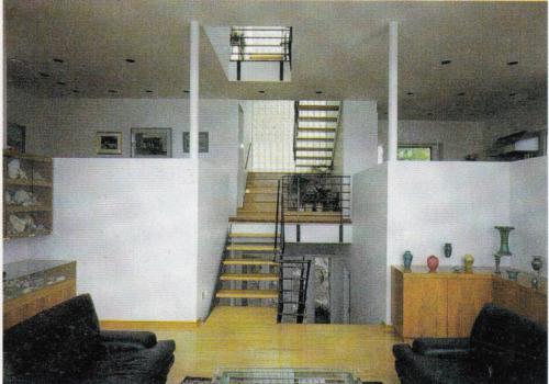 住宅設(shè)計成塔狀的四層建筑,以配合巖石地況。住宅的入口在頂層,起居室在中間層,客房和娛樂室在下層,兩層高的地下室包括酒窖、機械室和儲藏室,另外有一個8m長的橋從原存的停車場通往住宅,羅伯森住宅造型為豎直的體形,在以水平線條為主的湖景及自然造物中,以與之對立的垂直線條的人造物形成鮮明的對比,這種對立于自然的構(gòu)思滲透到設(shè)計的整個過程和住宅的各個局部。