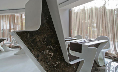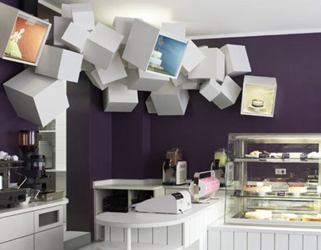 簡單時尚的咖啡廳設(shè)計,黑白灰風(fēng)格,以白色作為主題,尤其是墻上的白色蛋糕盒,讓整個咖啡廳空間充滿另類情趣~~