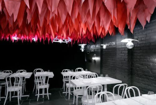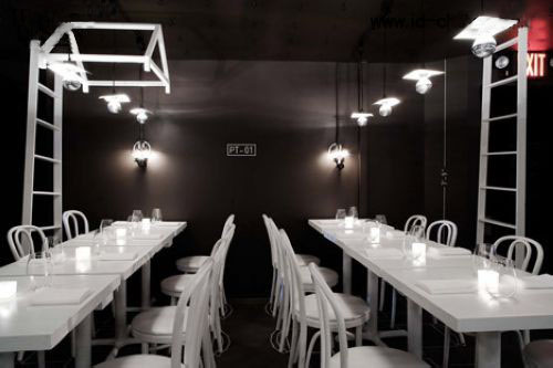 您現(xiàn)在所在的位置:首頁>會所設(shè)計>餐飲會所設(shè)計>正文美國紐約的一家餐廳,“邂逅在此時此景”餐廳,所有的樓梯、天花與墻面均漆為黑色,室內(nèi)家具與燈飾也選擇了對比強烈的白色。此餐廳設(shè)計要求每月?lián)Q裝一次,建筑線圖與標(biāo)識噴在了墻面與天花上,在每次的室內(nèi)換裝過程中,這些細(xì)節(jié)都會改變。