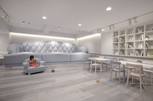 人們印象中的兒童空間大都在顏色上色彩斑斕,認為這樣的色彩會進一步開發(fā)孩子的創(chuàng)新能力與識別能力,但兒童咖啡館設計卻反其道而行之!白、藍、灰三色是咖啡館的全部顏色,冷色調使得這個空間更加空靈、理性,更加社會化。