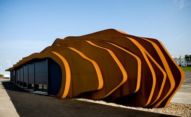 East Beach Cafe 形如這塊遼闊的driftwood ,洗滌行動岸邊,生銹的金屬外殼undulates節(jié),像戒指,木材已被平滑大海。規(guī)模和物質(zhì)的結(jié)構(gòu),加上其獨特的外形和設(shè)置,使不平凡的對比中有機及工業(yè),自然災(zāi)害和人為造成的。
