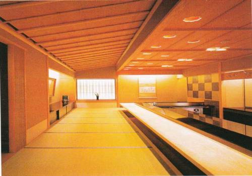 端部設(shè)有日本和室中獨(dú)有的“床の間”和“床脇”等裝飾壁龕。座席為下沉式蹋蹋米席。條形柜臺(tái)的內(nèi)側(cè)是開敞式廚房。