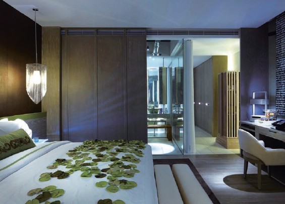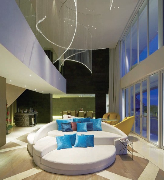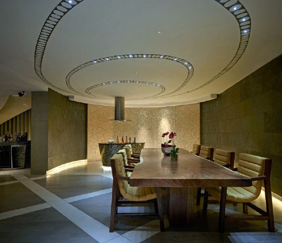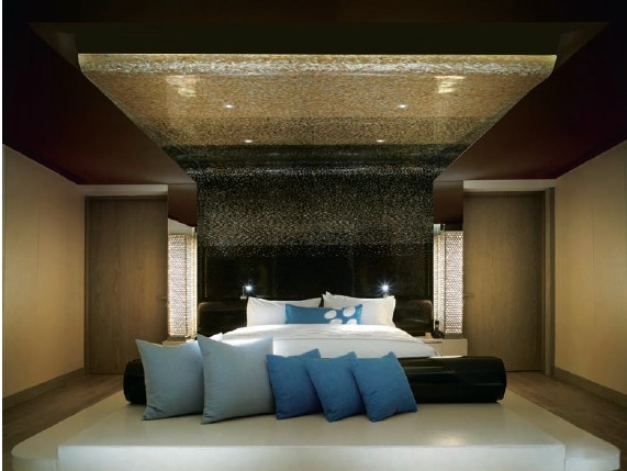 客人們能感覺到一種極為放松的環(huán)境,可以俯瞰水池,或在木制平臺(tái)上的休息區(qū)休息。帶頂棚的休息區(qū)為客戶提供了休閑座椅,其中有趣的零散坐墊和巨浪形織物則帶給人們一種零壓力的感覺。姿態(tài)獨(dú)特的多層沙發(fā)為各種客人提供更多座位,鼓勵(lì)人們互相交流。在客廳,一張用熱帶木材制作的八人餐桌占據(jù)了中心位置。整個(gè)洗浴中心設(shè)計(jì)加入了水影、感官形狀、水母、睡蓮葉和荷花等主題元素。