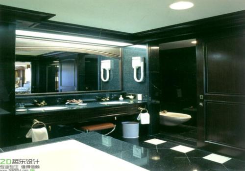 黑白是永恒的流行色,在這樣一個(gè)經(jīng)典空間里,就可以選擇設(shè)計(jì)風(fēng)格一致,但形態(tài)、色彩、質(zhì)感各異的家具。衛(wèi)生間干區(qū)的皮質(zhì)軟墻、濕區(qū)馬賽克的拼貼,造型感十足的玻璃質(zhì)吊燈以及線條明朗的潔具,它們都簡(jiǎn)潔而富有張力,共同打造了一個(gè)質(zhì)感豐富的空間。