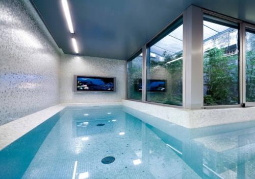?。穑颍椋觯幔簦濉。螅穑嵝蓍e會(huì)所療養(yǎng)區(qū)包括一間溫水浴室、一間淋浴房、一個(gè)帶有逆流和漩渦地帶的游泳池。溫水浴室內(nèi)發(fā)熱的墻壁、地面、和座位可起到放松身心的作用。淋浴噴頭被嵌入天花板內(nèi),上萬的嵌板將水流細(xì)分,噴淋而下形成雨簾,花灑可以與之同時(shí)使用。嵌板內(nèi)同時(shí)裝有照明設(shè)施。