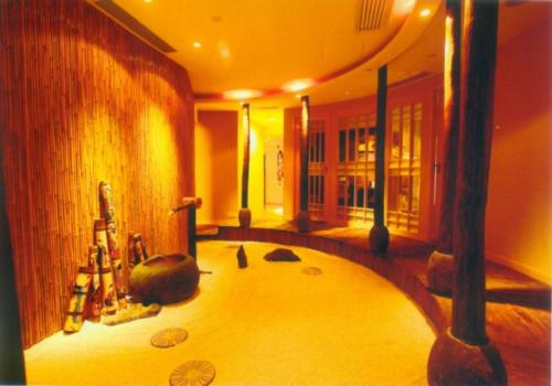 庭園位于水療中心兩條主軸線的相交的核心,環(huán)繞四周的是一個彎形榆木走廊平臺,顧客在庭內(nèi)享受噴霧系統(tǒng)所營造的晨霧氣氛及水滴聲,令人感受到大自然的恬靜與和諧的同時,又增添了一份禪趣。