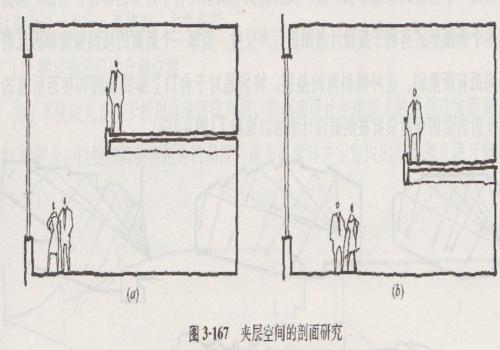 比較一下圖3-167兩個(gè)剖面:(a)方案夾層樓板偏上,(b)方案夾層樓板居下。以人的正常尺度和空間比例來衡量,顯然(a)方案樓板“吊”得太高,尺度不合適;而(b)方案樓板使下部空間矮于上部空間,與人的尺度親近,觀感較好。而且,夾層空間作為公共空間與下層高大公共空間相互流通;而夾層下部低矮空間作為服務(wù)空間或過渡空間,其空間形態(tài)也恰到好處。