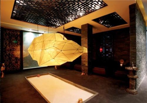 位于中央的區(qū)域同樣也有兩處從天花板頂部潺潺流下的瀑布,另外還有個時尚的大型中式吊燈。瀑布的水流聲營造出種靜謐祥和的氛圍,外形不規(guī)則的吊燈起到了區(qū)域隔斷的作用,同時給各空間提供了定的光照度。