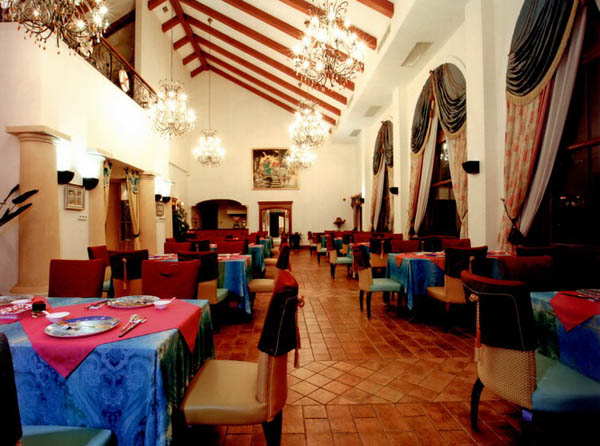 走進會所大廳,可以感受到空氣中無處不在的禪意。餐飲設(shè)計藍(lán)色的桌布在略顯紅色的環(huán)境中顯得獨具特色,拉簾黃色中點綴著一點藍(lán),東南亞風(fēng)情就流露在空間。