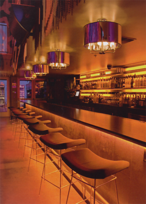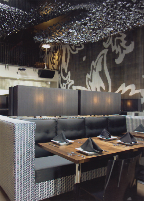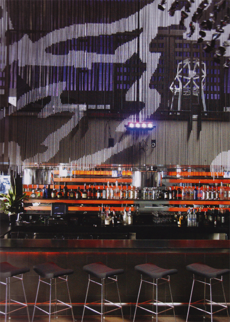?。停铮簦椋舻脑O(shè)計善于運用非傳統(tǒng)材料,如利用延伸的光滑的高分子薄膜,在DJ區(qū)營造一個能夠反射各種顏色和圖案的波浪狀天花板。設(shè)計師運用了最尖端的亞洲陳設(shè),加上KennethCobonpue的傳統(tǒng)材料和KonstantinGrcic的現(xiàn)代主義風(fēng)格,所有的這一切與六七十年代TommiParzinger風(fēng)格的華麗垂飾和光滑的黑絲綢線形燈罩完美地融合起來。