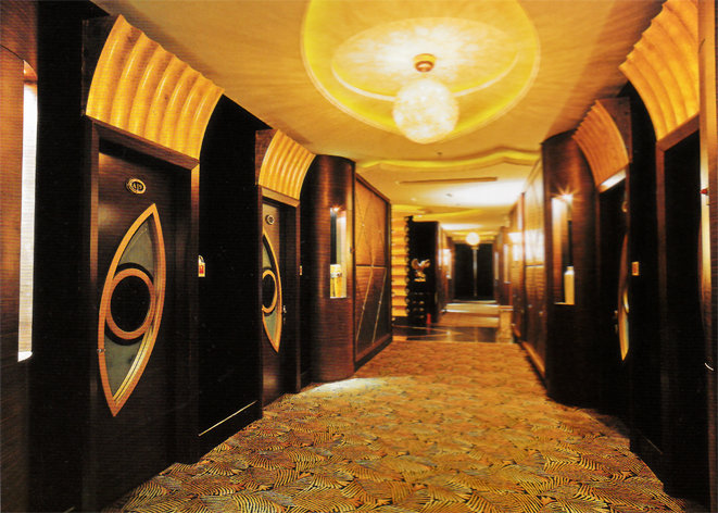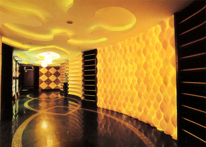 這個夜總會叫做明珠夜總會。它通過對材質(zhì)、色彩、燈光等組合設(shè)計,創(chuàng)造出一個絢爛、奢華、令人沉醉的娛樂空間。夜總會的整個空間以金色和黑色為主,在其間搭配了各種金屬材質(zhì)的擺設(shè)。人口的大片金色飾面和LED燈光,展現(xiàn)出華麗的夜場特色,客人從此處將步入帝王般的享受空間。在各通道和房間里,燈光的明暗、抑揚、強弱等設(shè)計營造了典雅、安全、舒適的娛樂環(huán)境。