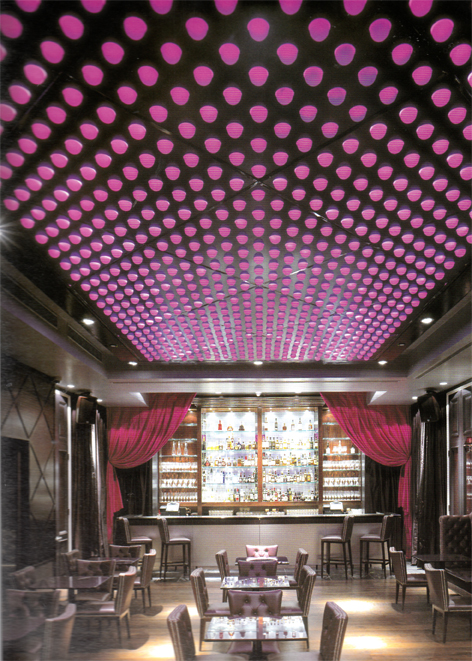 從首層地上鑲嵌的木框壁龕到底層上被金光閃閃的圓片覆蓋的吧臺,巨大的門,彎曲的階梯,半透明的絲綢簾子,不斷變幻重組的LED燈光,都能為人們帶來無盡的歡樂,并充分展示了這種夜場設(shè)計的特點。