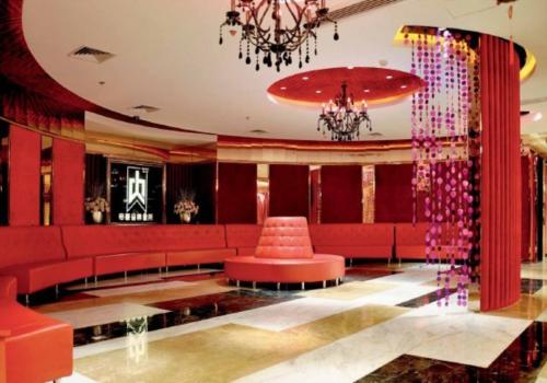 橙色的燈光一一亮起,隨處可見的似有若無的玻璃泡泡,頂面軟包和鏡子的混合,大塊包框斜面的鏡子,大量亮光鈦金的運用,黑色和紅色絨布的巧妙對比,空間上的層疊交錯,使人產(chǎn)生迷離夢幻的感覺,在其奢華和高貴的背后,依然充溢著一種奇妙的設計張力。