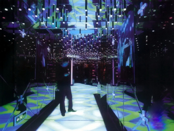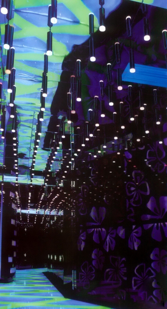 這個設(shè)計將流行、時尚。抽象的藝術(shù)語言,通過現(xiàn)代的裝飾材料來表現(xiàn)。在圖形語言上,設(shè)計師貫穿整場使用雙層菱形,具有工業(yè)感的“電路板”形。這些圖形靈感大多來源于世界頂級時裝發(fā)布會上時裝的衣料或源于生活的積累。在材料表現(xiàn)上,設(shè)計師抓住了室內(nèi)裝飾材料的主要特點,如光亮的和粗糙的,剪影的和柔軟的,不發(fā)光的和發(fā)光的(內(nèi)部藏?zé)艨梢酝腹獾牟牧希?,用上述不同屬性的材料通過對比和構(gòu)成的手法來表現(xiàn)前面所描述的時尚語言。夜總會的燈光配置是最為關(guān)鍵的,即將人的情感作為空間的“長”“寬”“高”“時間”這四種元素之外的第五種元素,在燈光設(shè)計上,以“深遠(yuǎn)”“透明”的藍(lán)光和“曖昧”“神秘”的紫光來表達(dá),配以局部的LED、EL可變色燈光。單色光和變色光的比例定為7:3,竣工后的效果證明這種比例是十分合適的。