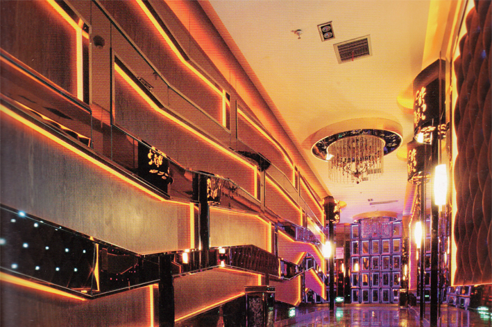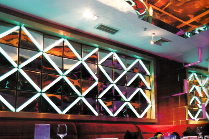 本俱樂(lè)部的設(shè)計(jì)師將流行、時(shí)尚、抽象的藝術(shù)語(yǔ)言,通過(guò)現(xiàn)代的裝飾材料來(lái)表現(xiàn)。從圖像語(yǔ)言上,夜場(chǎng)設(shè)計(jì)師貫穿整場(chǎng)使用雙層邊菱形、具有工業(yè)感的“電路板”形、具有裝飾感的大花形,這些圖形靈感大多來(lái)源于世界頂級(jí)時(shí)裝發(fā)布會(huì)模特的衣料或來(lái)源于生活的積累。在材料的表現(xiàn)上,設(shè)計(jì)師抓住了室內(nèi)裝飾材料的注意特點(diǎn),如光亮的和粗糙的,堅(jiān)硬的和柔軟的,不發(fā)光的和發(fā)光的,并用上述不同屬性的材料通過(guò)對(duì)比和構(gòu)成的手法來(lái)表現(xiàn)前面所描述的時(shí)尚語(yǔ)言。在燈光設(shè)置上,以“深遠(yuǎn)”、“透明”的藍(lán)光和“曖昧”、“神秘”的紫光來(lái)表達(dá),配以局部的LED、EL可變色燈光。