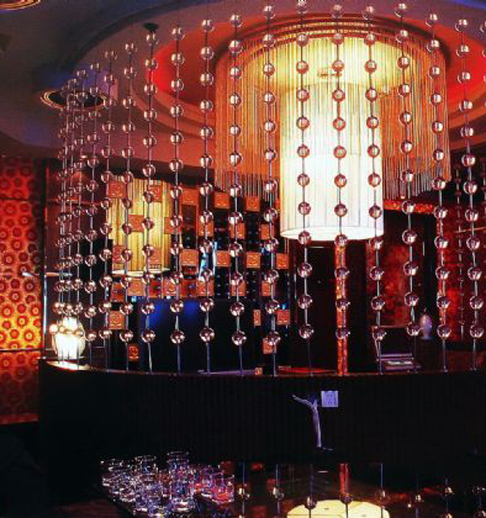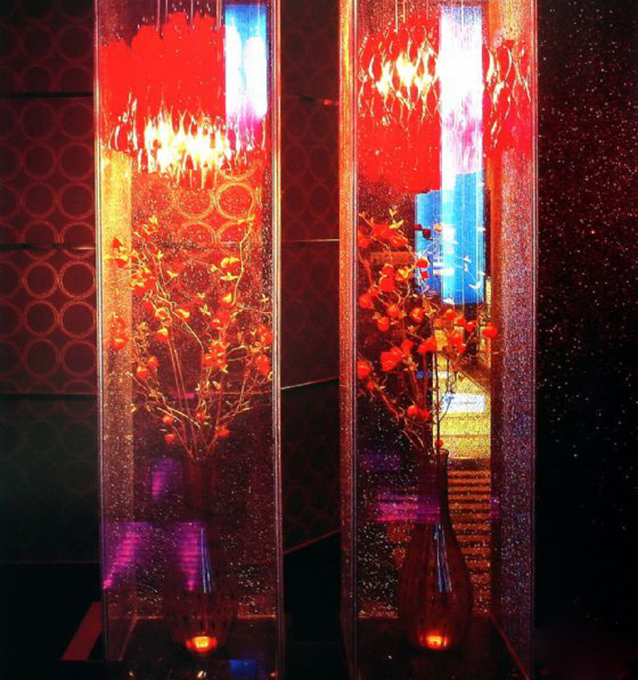 夜總會(huì)--天津皇冠明珠夜總會(huì)-簡(jiǎn)潔的工藝插花與玻璃扭紋吊燈鑲進(jìn)玻璃柱內(nèi),精美得像是琥珀。