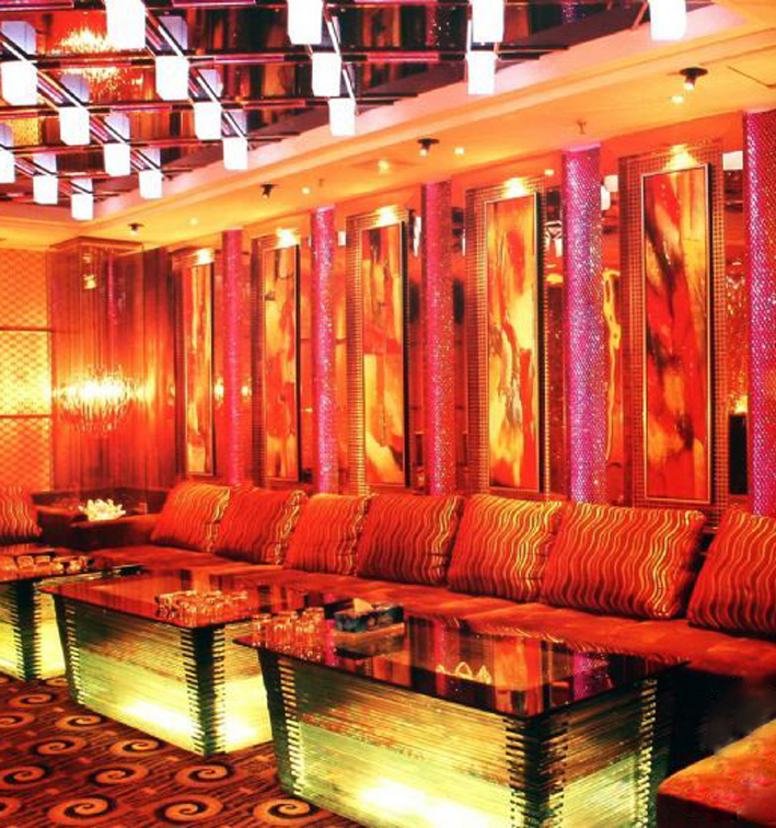夜總會(huì)設(shè)計(jì)--天津皇冠明珠夜總會(huì)-寫(xiě)意式的抽象裝飾畫(huà),具象的實(shí)物擺設(shè),金與赤色調(diào)的和諧,喜氣洋洋的燈光,恍如一個(gè)充滿(mǎn)貴氣的溫馨之家,滿(mǎn)載歡樂(lè),有著濃郁的中國(guó)氣息。