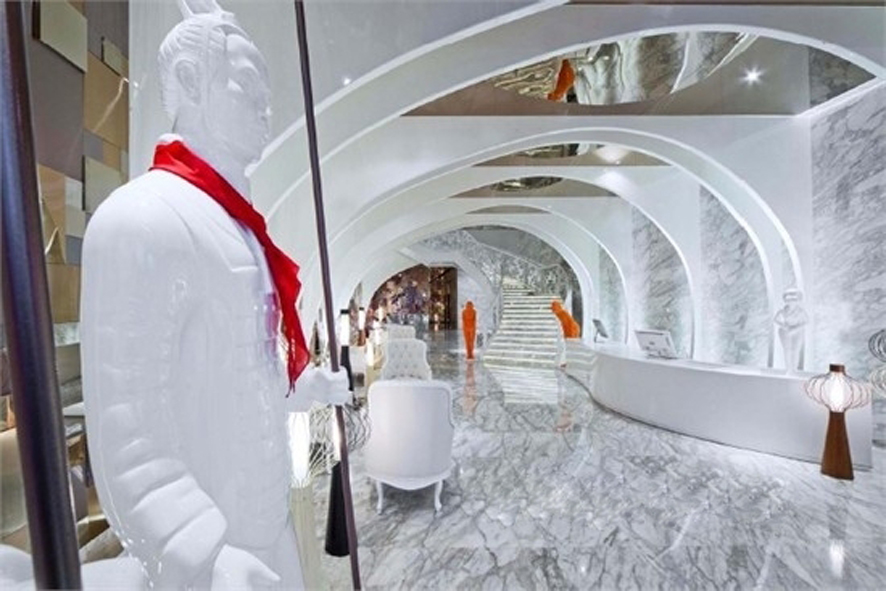 樓下入口大堂與二樓接待區(qū)以精致的白色螺旋樓梯連在一起,形成一個多用途空間,即可接待等候的顧客,亦有舞臺可作現(xiàn)場表演來推廣藝術(shù),四邊擺設(shè)的巨型陶俑及人像雕塑似在歡迎來客進入這個充滿了由當(dāng)?shù)厮囆g(shù)家創(chuàng)作的傳統(tǒng)和現(xiàn)代作品的展覽館。